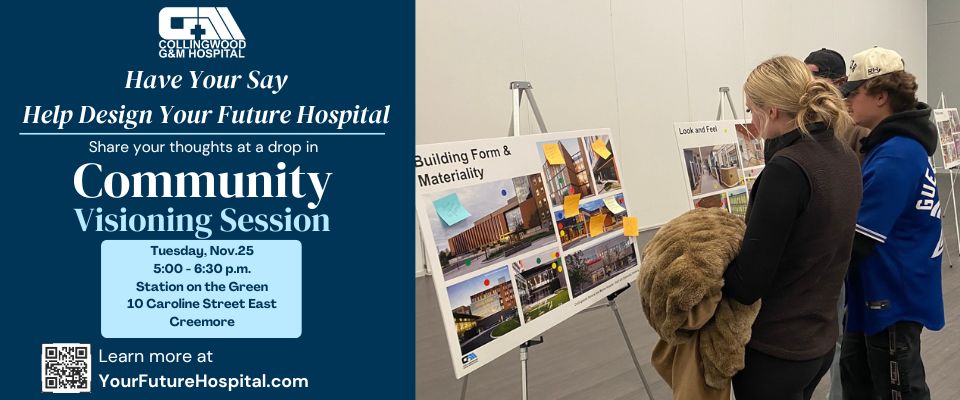 Collingwood General and Marine Hospital (CGMH) is holding a visioning session in Creemore on Nov. 25 to gather input into early design concepts for the new hospital. “Every community has its own [...]