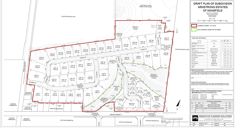 Mansfield area residents had a chance to peek at a draft plan of subdivision for the proposed Armstrong Estates development and pose questions at a virtual open house event on June 29. The event was hosted by Innovative Planning Solutions (IPS) on behalf of the numbered company which owns the subject lands near the intersection of Airport Road and County Road 17.
