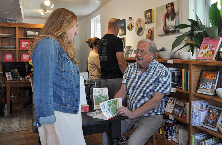 Trina Berlo photo: Dan Needles held a book signing at Curiosity House Books on Saturday at the launch of his new memoir Finding Larkspur – A Return to Village Life, where he signed a book for Vivienne Bent, whose father went to school with Needles.