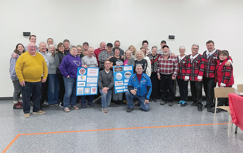 A successful mixed bonspiel was held Saturday, Jan. 6 at the Creemore Curling Club. Teams travelled from Ivy, Guelph, Elmvale, Wasaga Beach, Collingwood, Durham, Markdale, Feversham and Creemore. The winning team was from the Durham and Markdale clubs, Bob Crawford (skip), Steve Frankland (Vice), Cheryl Crawford (2nd), and Dorothy Frankland (Lead). Thank you to all our sponsors which are displayed on the posters in the picture. Congratulations and great curling from all teams.
