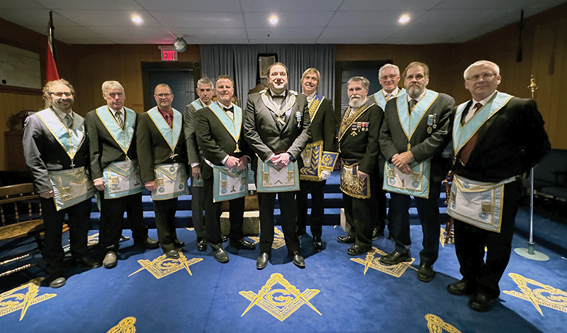 Nitetis Lodge held its Installation night on Monday evening. From left to right: Worshipful Bro. Corey Finkelstein, Outer Guard; Worshipful Bro. Jeff Fachnie, Chaplin; Bro. Dwayne Wyant, Senior Deacon; Brian Doran, Treasurer; Bro. A.J. Quinn, Senior Warden; Worshipful Master, Walker Coe; Right Worshipful Bro. Justin Heran; District Deputy Grand Master Georgian South; Right Worshipful Bro. Brian Lawson, Director of Ceremonies; Bro. Ingo Steinmar, Junior Deacon; Worshipful Bro. Steve Jago, Junior Warden; Bro. Arthur Jaworowski, Senior Steward. Absent: Very Worshipful Bro. Jerry Sampson, Immediate Past Master; Bro. Don McConnell, Junior Steward; Worshipful Bro. Randy Neiman, Inner Guard.
