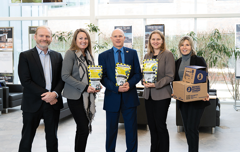 Contributed photo – From left: Rob Elliott, General Manager, Engineering, Planning and Environment, (Simcoe County); Jennifer Coughlin, Deputy Warden (Simcoe County); Basil Clarke, Warden (Simcoe County); Laura Barrett, Collections Manager (Simcoe County); Sophie Zabonas-Ross, Director, Account Management, Call2Recycle.