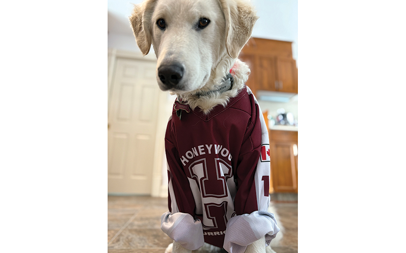 Contributed photo: Jeanette McFarlane’s dog Jenni dons the Honeywood Hurricanes jersey. April 4 has been declared jersey day, when everyone is encouraged to wear their favourite jersey in support of Honeywood’s Kraft Hockeyville bid.