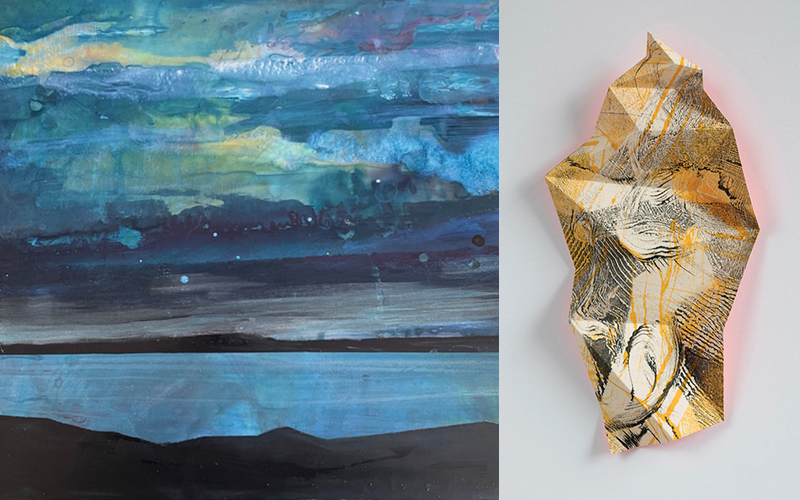 Brown’s sculptural encaustic forms and monotypes fold and shift like geological formations, evoking both the power and fragility of nature’s structures.