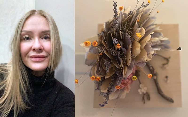 “It was a very weird journey,” she said. “My daughter works in film and gets lots of things given to her. She dropped off a bunch of dried flowers. I added feathers and it grew into this ethereal floating object.”