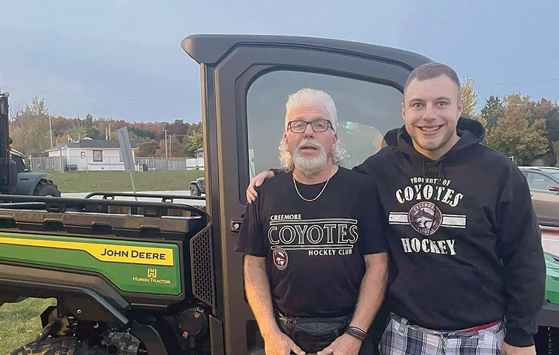 Contributed photo: Creemore Coyotes general manager Tom Macham (left) poses with Matt Saddler, who sang the National Anthem at the home opener on Saturday night, in front of the Huron Tractor gator that was filled with Huron Tractor hats given away free to fans.