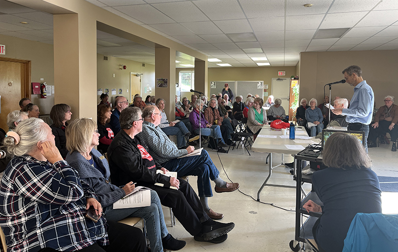 Hosted by MC2 (Mulmur-Mono Citizens Coalition), the meeting was a response to Strada Aggregates’ October application to blast and extract limestone at an existing sand and gravel pit located east of Horning’s Mills. The proposed extraction area is 65.7 hectares, equivalent to 110 Canadian football fields. The holding capacity of trenches and ponds is 1.7 billion litres, equivalent to 640 Olympic swimming pools. The deadline for public comment is Nov. 10.